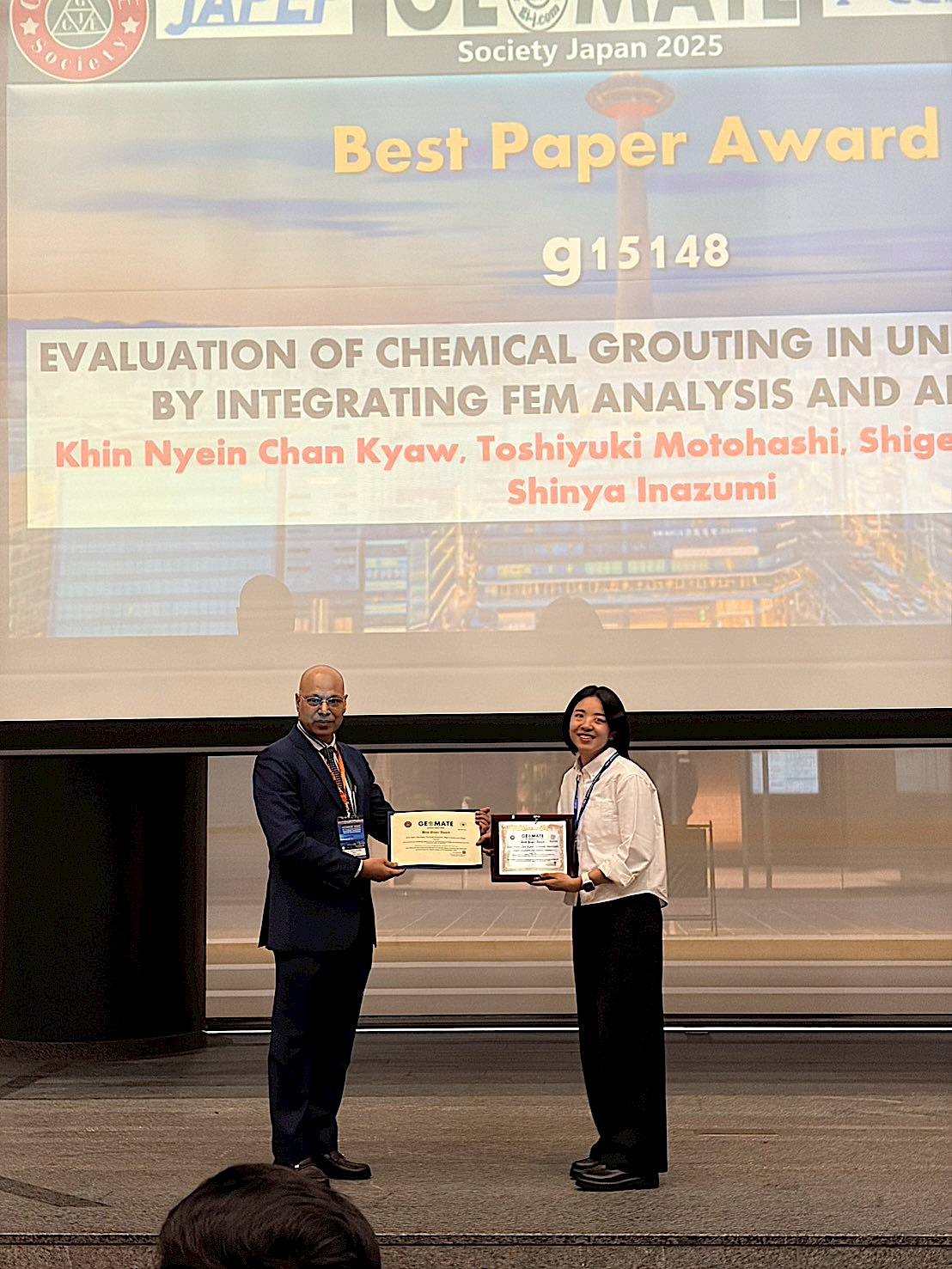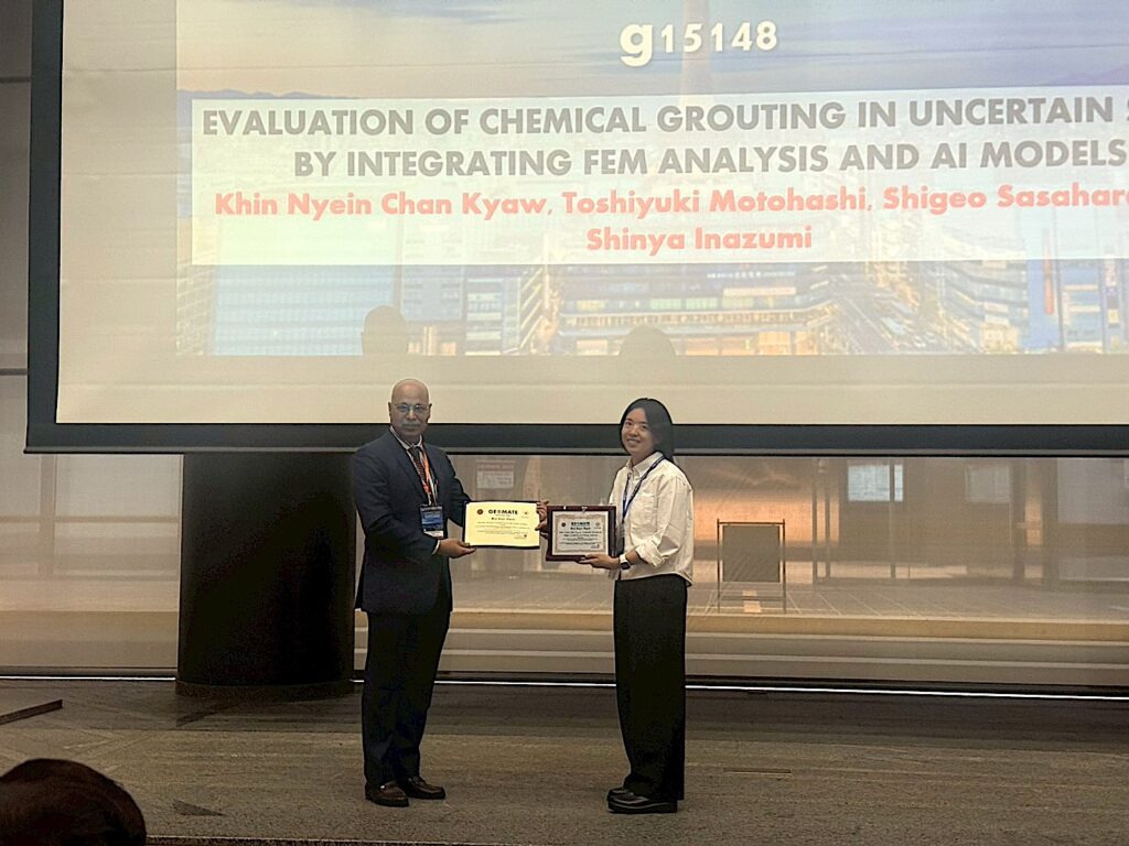 At GEOMATE 2025, Ms. Khin Nyein-Chan Kyaw (D2) was honored with the ‘Best Paper Award’ for her outstanding paper, for which she served as the first author and presenter.